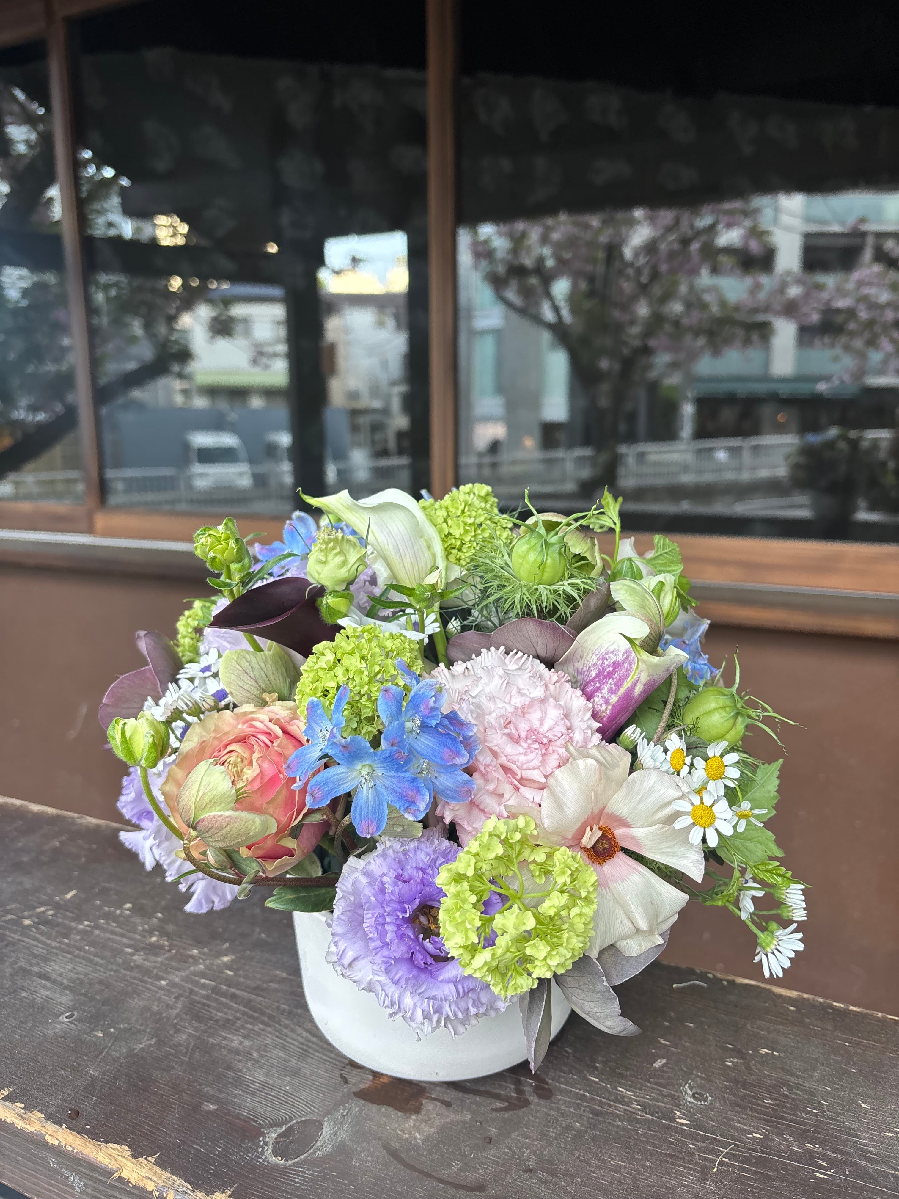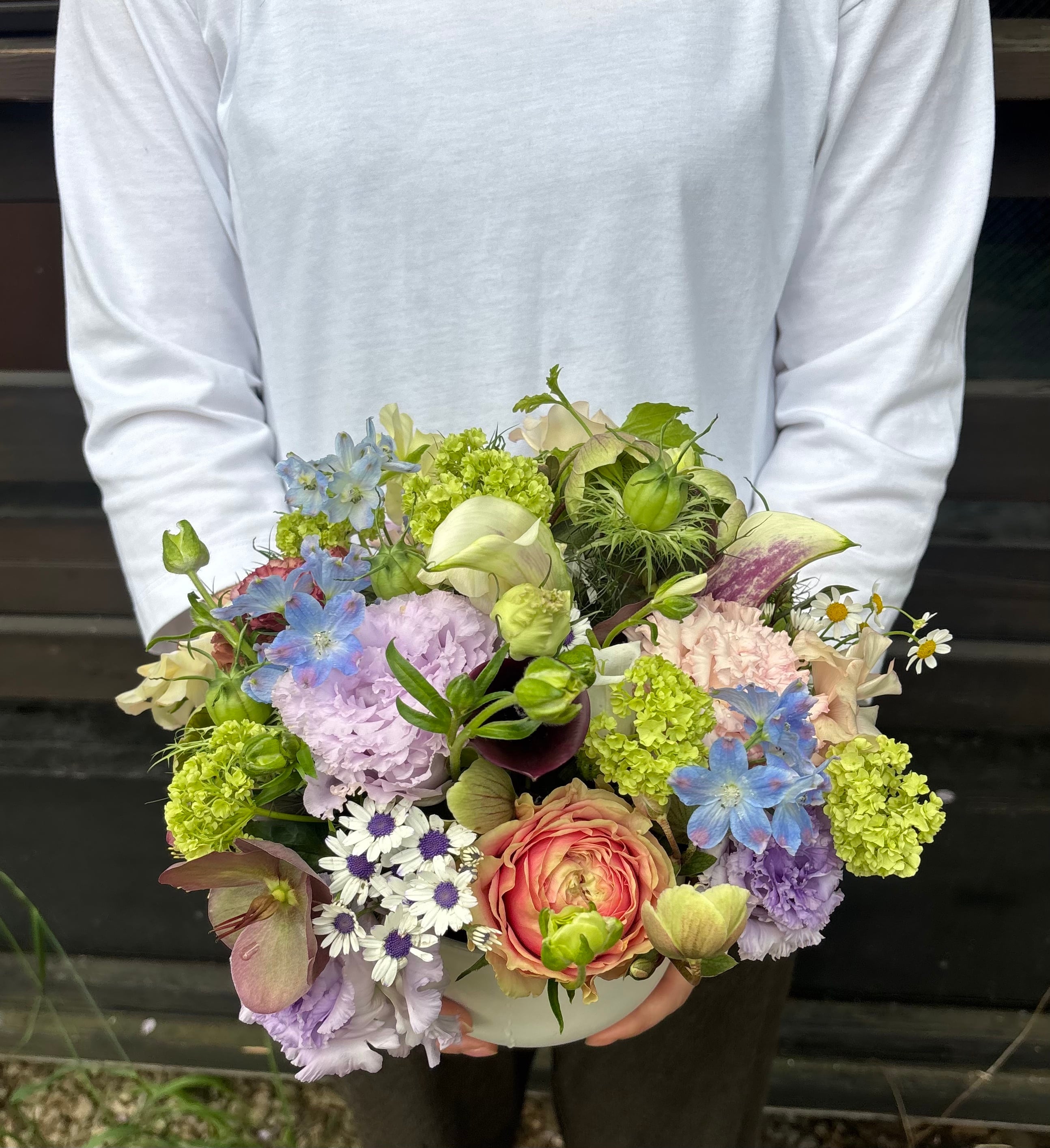 多彩な草花を贅沢にミックスし、自然な奥行きと瑞々しさを大切に仕立てました。